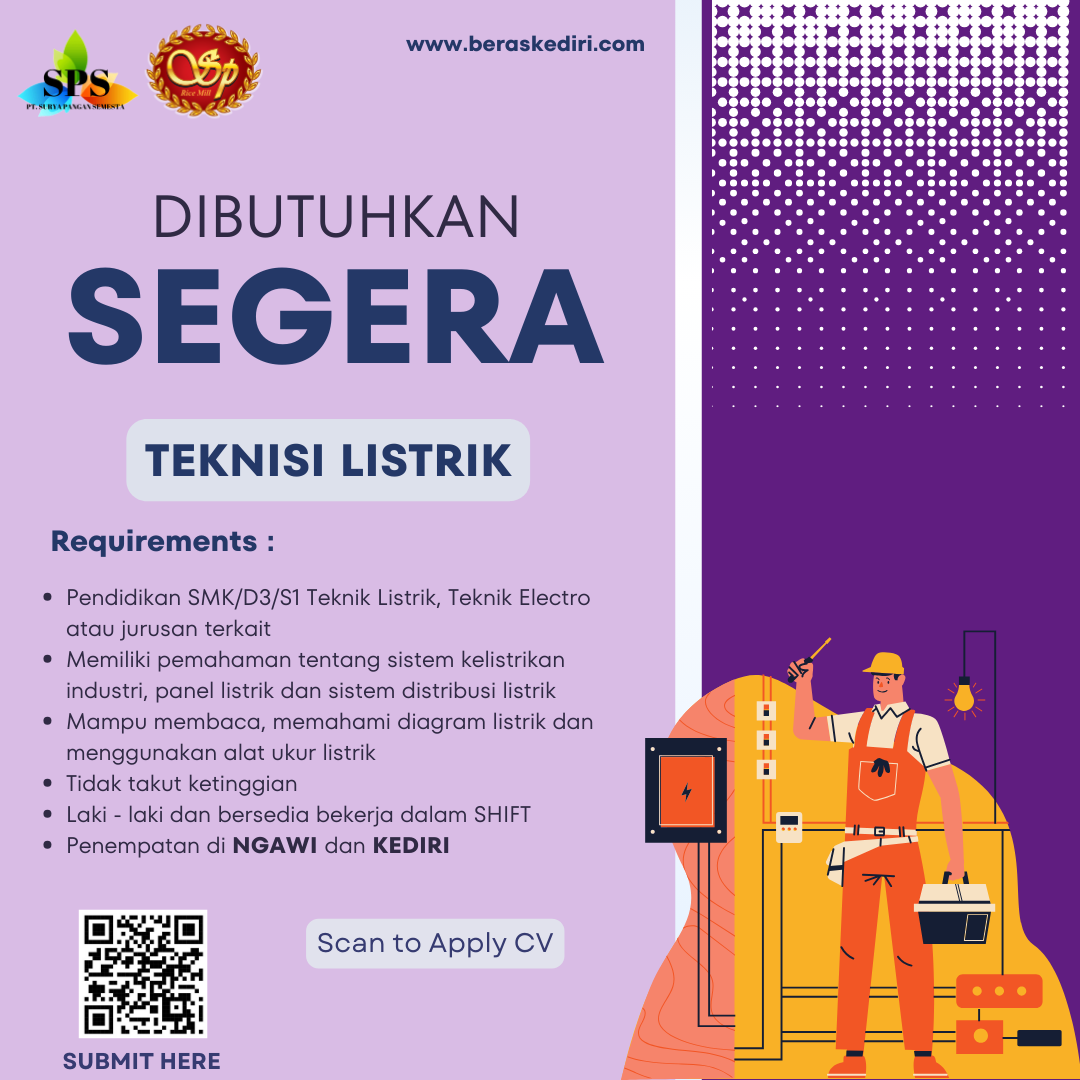Perusahaan Beras PT Surya Pangan Semesta sedang menerima Lowongan Kerja Baru Sebagai TEKNISISLISTRIK untuk Penempatan NGAWI dan KEDIRI Jawa Timur Segera kirimkan lamaran dan CV anda