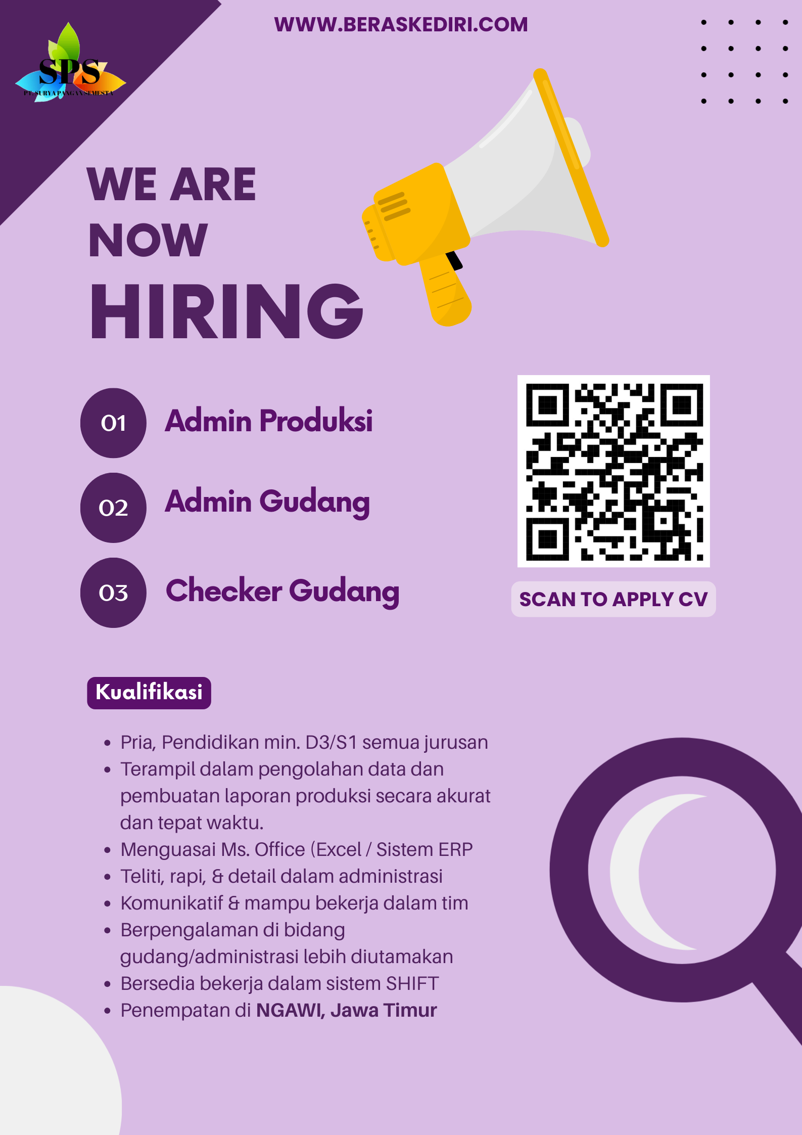 Perusahaan Beras PT Surya Pangan Semesta sedang menerima Lowongan Kerja Baru Sebagai ADMIN PRODUKSI, ADMIN GUDANG dan CHECKER GUDANG untuk Penempatan NGAWI Jawa Timur Segera kirimkan lamaran dan CV anda
