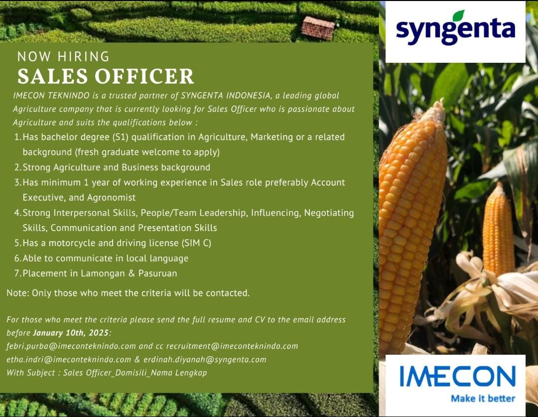 Perusahaan Multi Nasional Syngenta sedang membutuhkan karyawan untuk posisi SALES OFFICER, Segera kirimkan lamaran dan CV anda