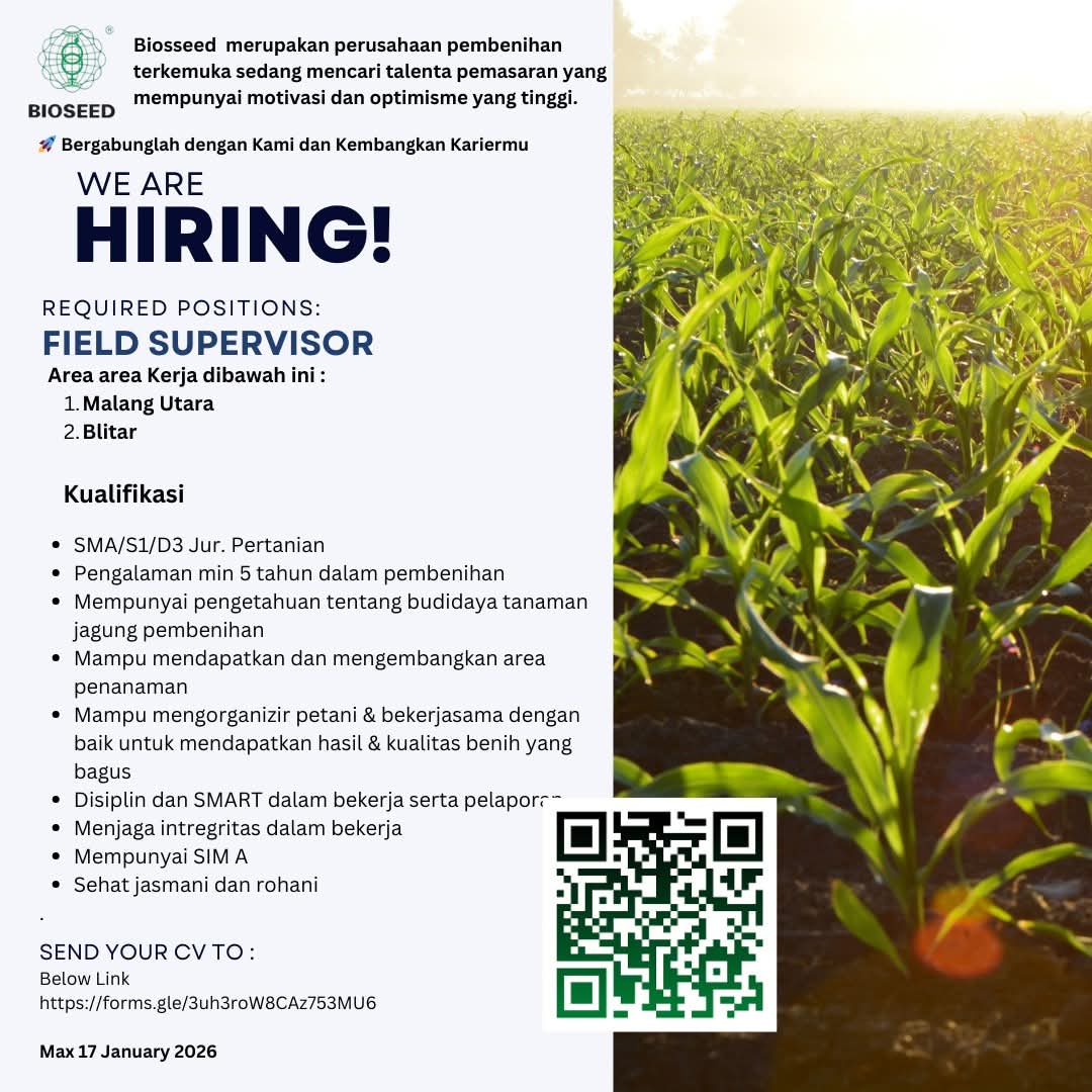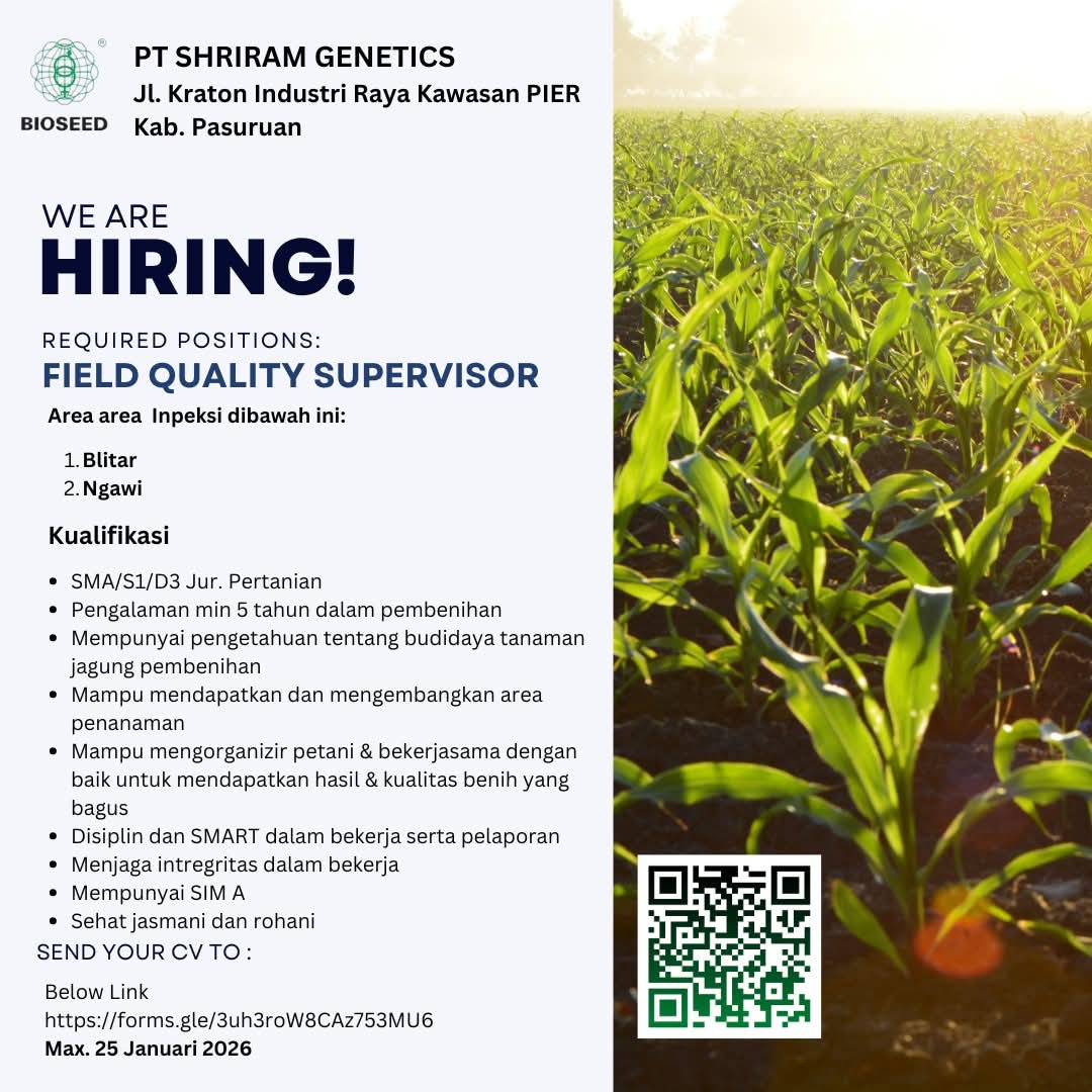 Hai sahabat job seeker, temukan karirmu bersama PT SHRIRAM GENETIS yang membuka lowongan pekerjaan untuk jabatan FIELD QUALITY SUPERVIOR untuk Wilayah Blitar dan Ngawi kirimkan CV Terbaikmu ! Max 25 Januari 2026