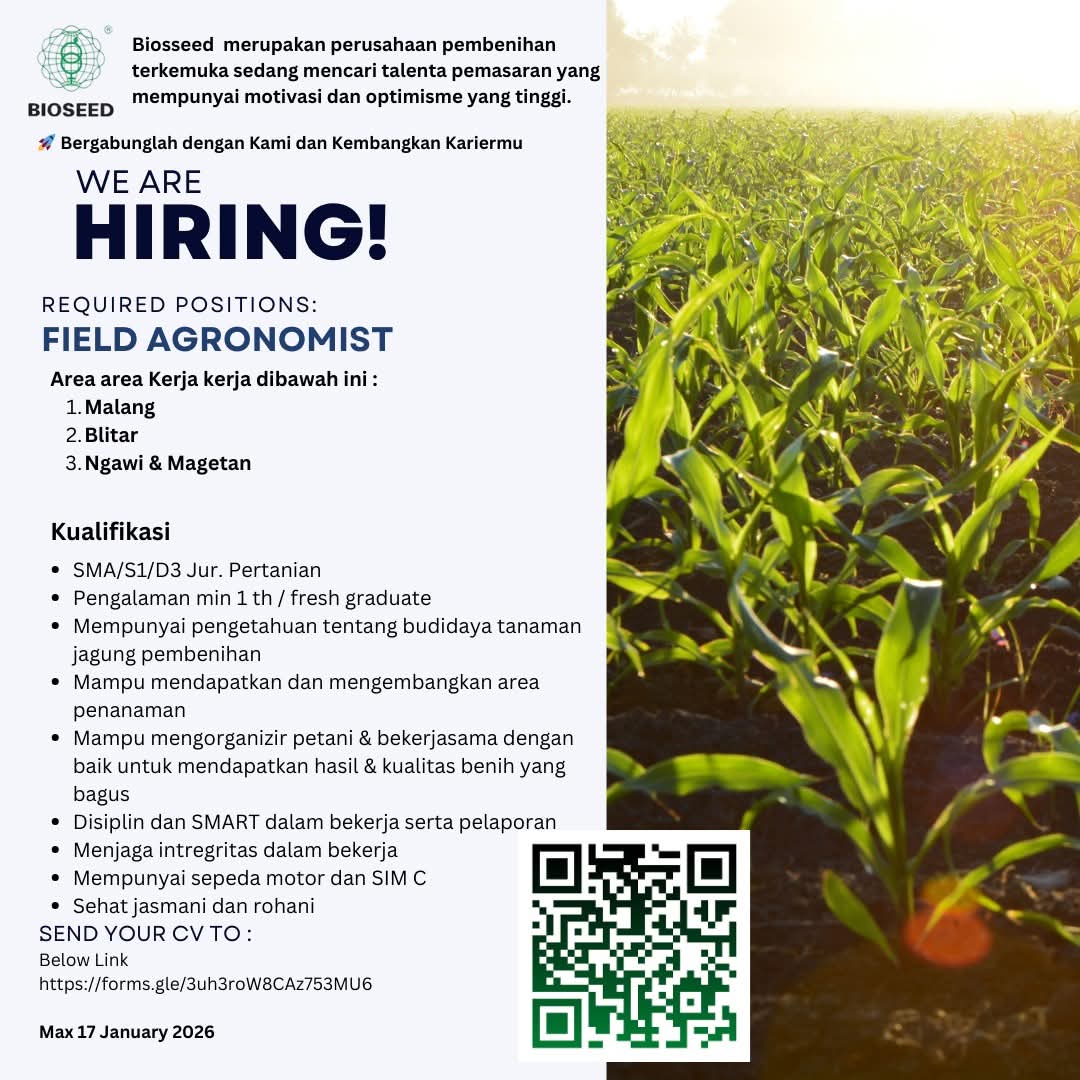 Hai sahabat job seeker, temukan karirmu bersama PT SHRIRAM GENETIS yang membuka lowongan pekerjaan untuk jabatan FIELD AGRONOMIST untuk Wilayah Malang, Blitar, Ngawi, Magetan, Segera kirimkan CV Terbaikmu ! Max 17 Januari 2026