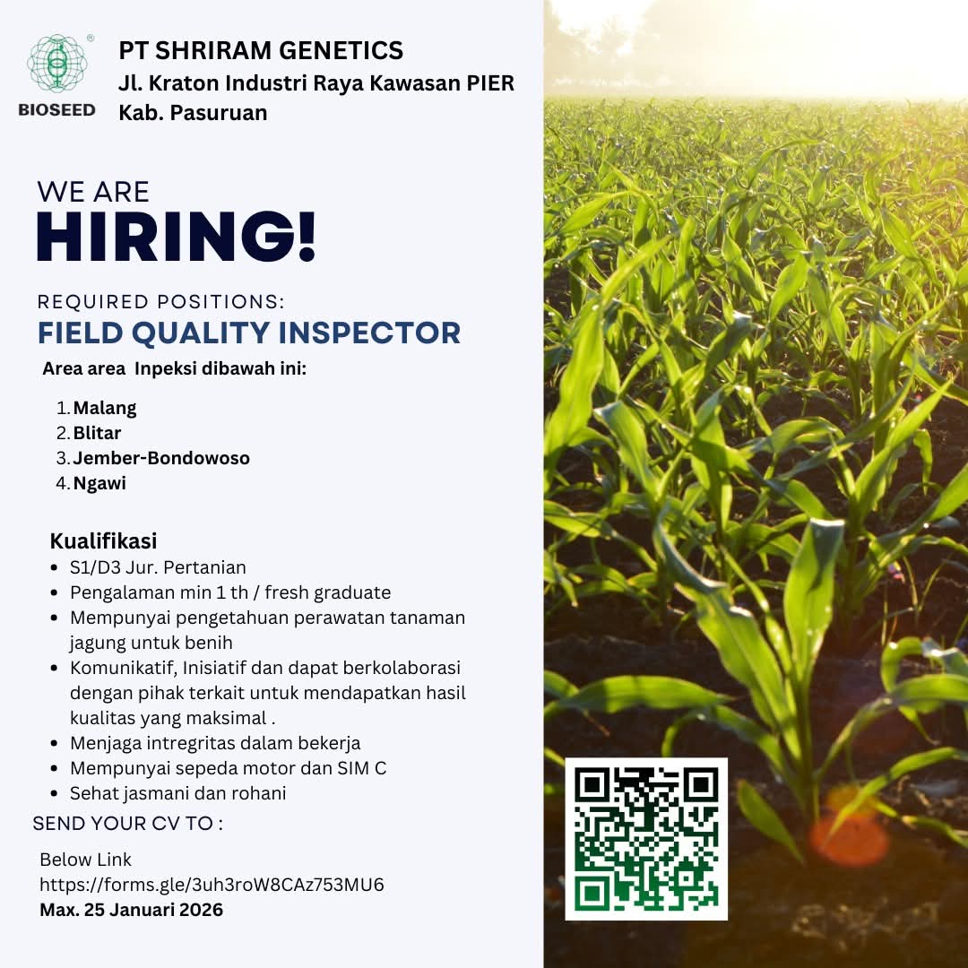PT. SHRIRAM GENETICS saat ini sedang membutuhkan karyawan untuk posisi FIELD QUALITY INSPECTOR, Segera kirimkan lamaran dan CV anda max. 25 Januari 2026