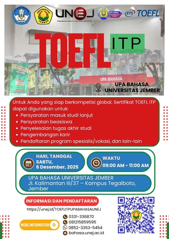 UPA Bahasa Universitas Jember (UNEJ) menyelenggarakan Test TOEFL-ITP, Sertifikat TOEFL ini bisa digunakan untuk persyaratan Pendidikan dan Karier, jangan lewatkan segera Hubungi untuk informasi selengkapnya