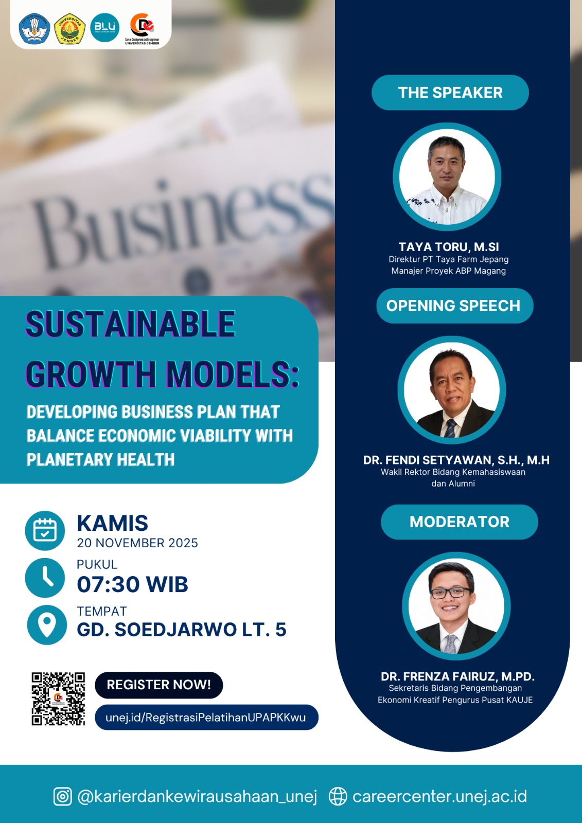 UPA Pengembangan Karier dan Kewirausahaan mengadakan Gelaran Kuliah Umum Inspiratif secara Luring “Sustainable Growth Models: Developing Business Plan that Balance Economic Viability with Planetary Health”